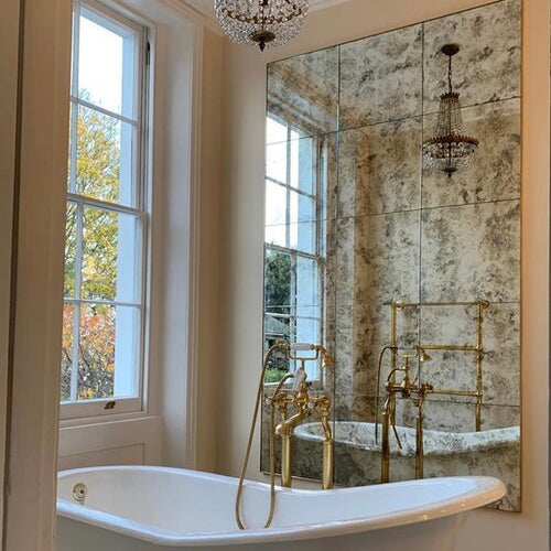 Create a focal point that commands attention in your space. Add depth, dimension to any environment with a bespoke vintage mirror tile wall.
