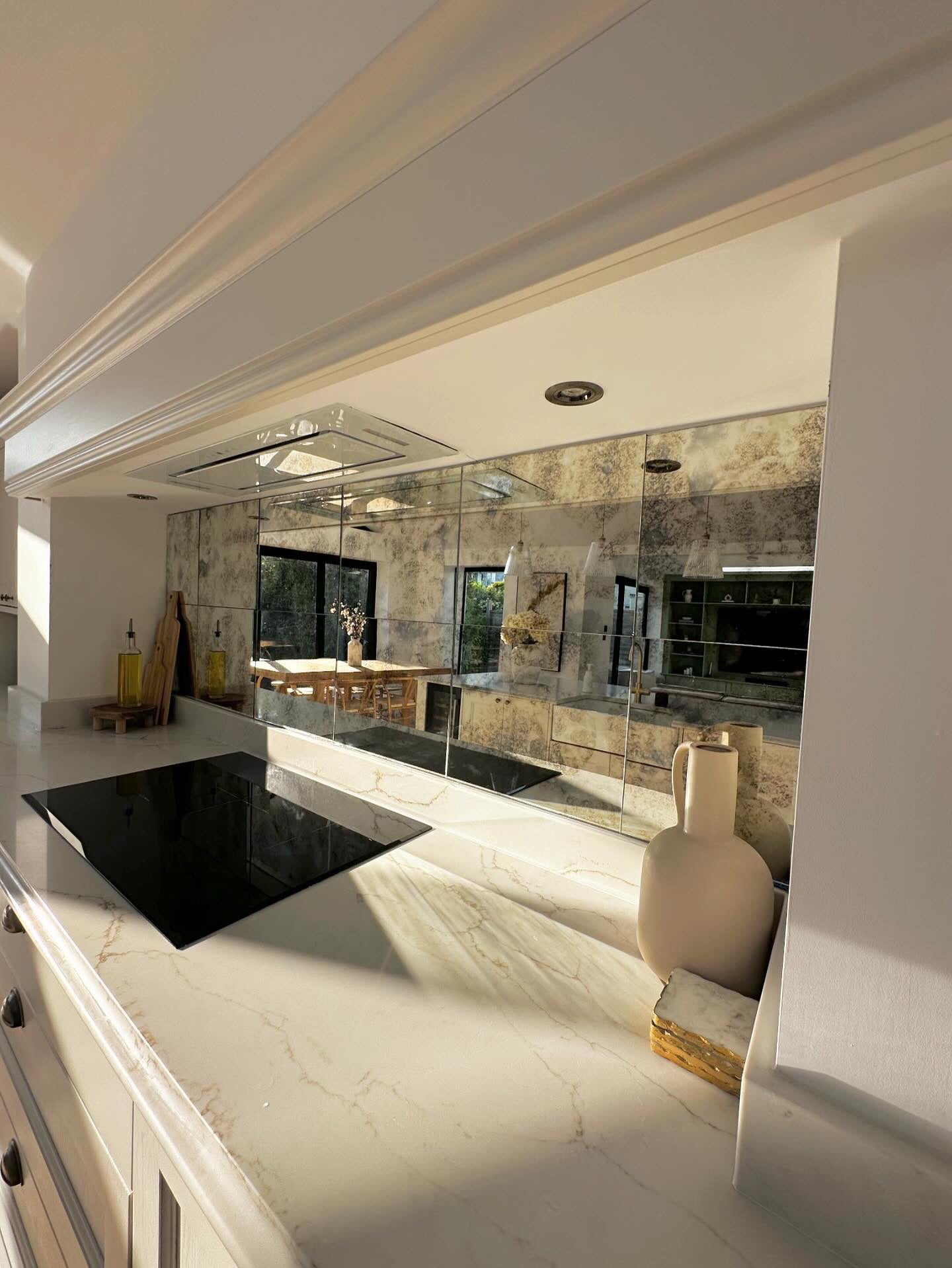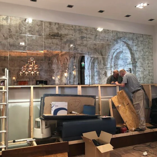 Our Antique Mirror Tiles can be easily applied to any solid surface. Follow our 8 steps below and create this look yourself using our professional adhesive. Downloadable guide also available below.